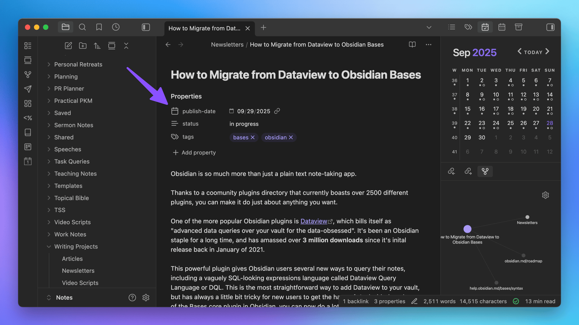 Prefer to read (or listen to) this newsletter in your browser? Click here. Dataview has been a popular Obsidian plugin for a very long time, with over 3 million downloads since its initial release back in January of 2021. But it's always been slow and a little tricky to use. It's also in the process of being replaced by its work-in-progress successor (Datacore), which brings additional features but a whole new syntax. Bottom line? Now is a great time to migrate from Dataview to Obsidian Bases. In this newsletter, I'm going to walk you through how to do it (though if you want even more detailed step-by-step instructions, check out the blog post here. It's about 3000 words and includes some code samples as well.) The Link Between Bases & PropertiesThere are several different types of Properties you can use in Obsidian: