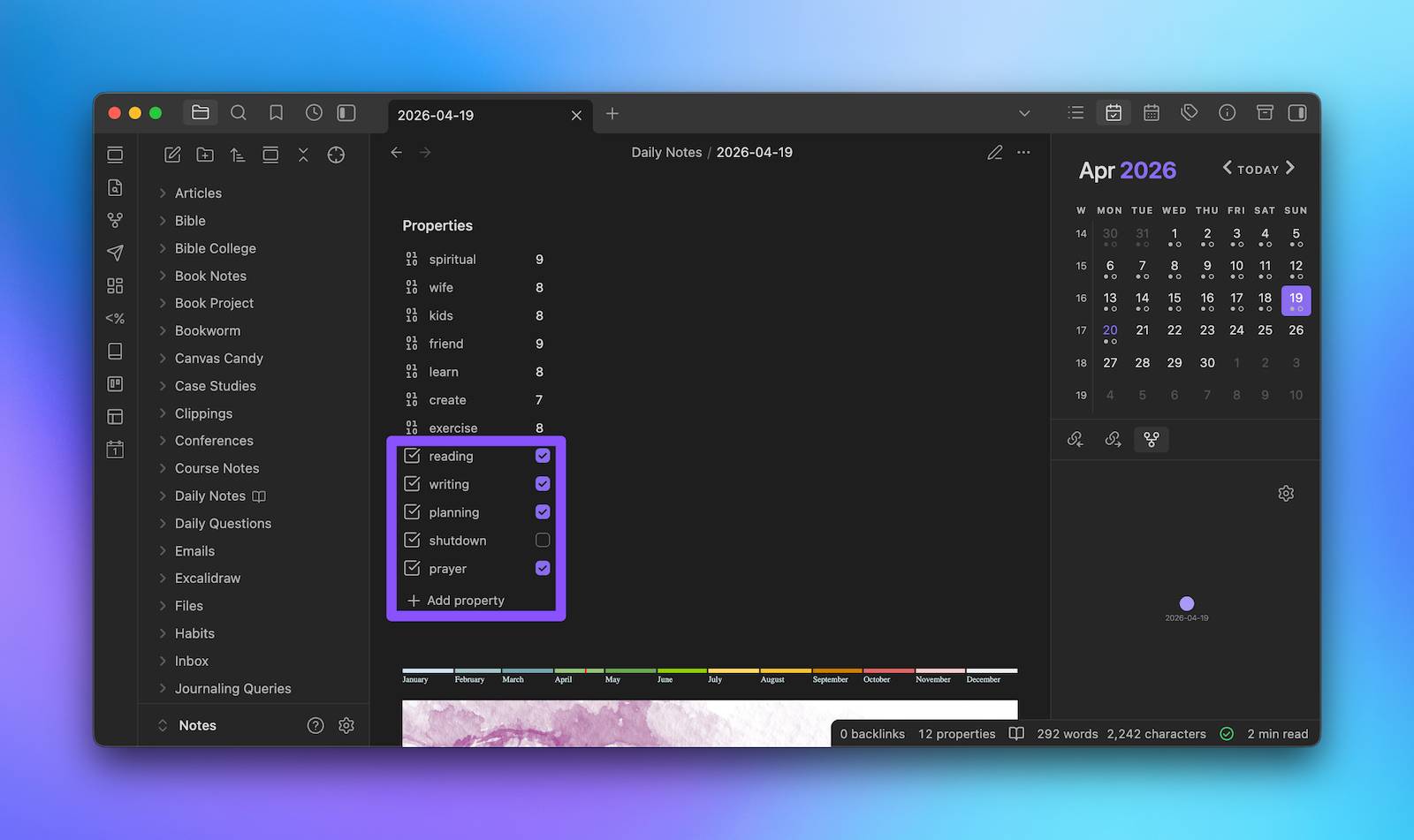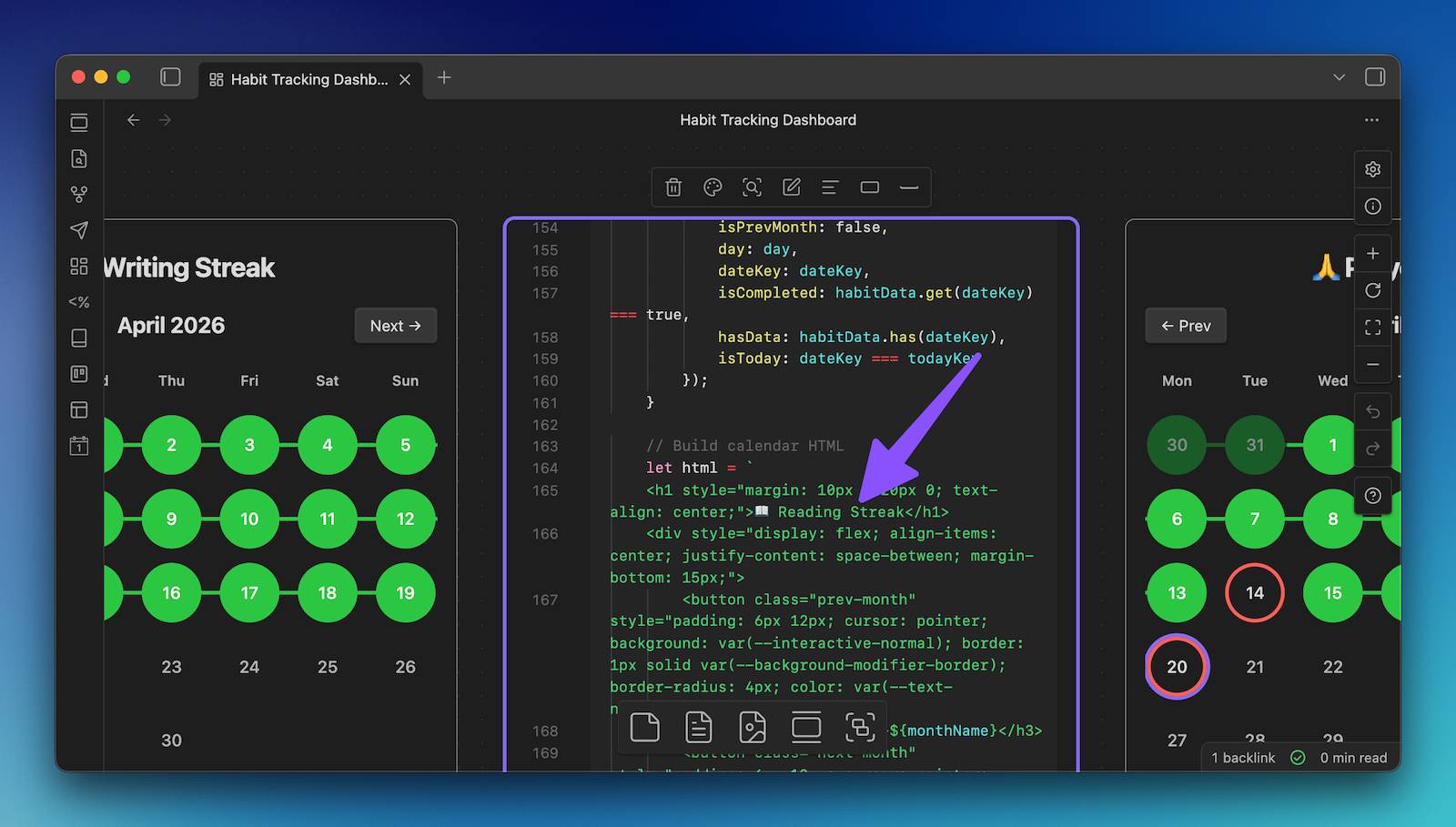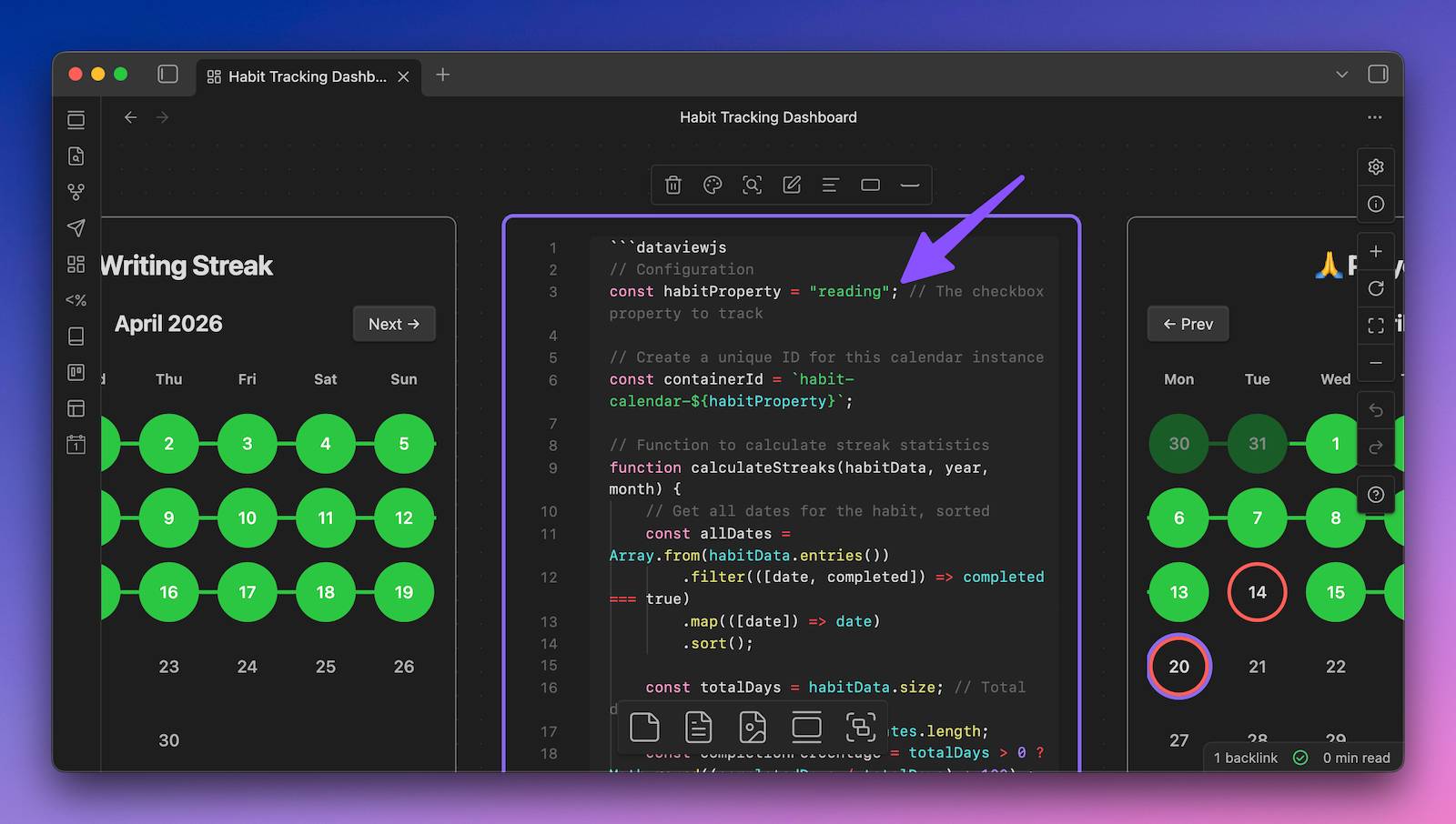 Both of those are useful to know. If the longest break in my reading habit is three days, that tells me something very different than if itās three weeks. Three days is a bad week. Three weeks is a pattern. And when I recognize it, I can actually investigate easily because the daily notes from that stretch are all right there. I can see whether it was one specific thing (a launch, a trip, a rough season) or a slow drift I didnāt notice while it was happening. Let me give you an example: Say I pull up the dashboard during my quarterly Personal Retreat and I see a 12-day gap in my writing habit back in October. My first question isnāt āwhy did I miss so much?ā Itās āwhat was going on during those 12 days?ā So I click into the first daily note in the gap. Maybe I find out I was prepping for a conference that week. The next note mentions I got sick. The next few notes show I was playing catch-up on everything I missed. By the time Iām done, Iāve reconstructed the whole story ā and now I can ask a much better question. Not āhow do I never miss again?ā but āwhatās my system for protecting this habit during high-stress weeks like this?ā Thatās a level of insight you canāt get from a standalone app. And itās actionable. It's the thing that actually helps you build better habits, because you can understand why the chain broke before you can fix it. Building the DashboardMy habit tracking dashboard is built as a Canvas file in Obsidian. Each habit gets its own card and its own code snippet. Each card shows a month-view calendar laid out Monday through Sunday, with completed days as solid green circles and missed days as red rings. When you hit consecutive days, green lines connect them across the calendar, so your streak literally becomes a visible chain. You can navigate between months. Click any date, and youāre in the daily note for that day. Below each calendar is a stats bar: current streak, longest streak, longest break, completion percentage, and total days completed. The whole thing is powered by a single Dataview code block per habit, reading checkbox properties from your daily notes. Thatās it. No plugins beyond Dataview. No maintenance. No hard-coded logic to untangle when you want to change something. Here's what the properties look like in my Daily Notes: As long as I check those boxes and those properties match the code snippets, the data automatically shows up on my habit tracking dashboard. Iām not going to walk through the full code snippet here, but I did add this new version to my free Obsidian Starter Vault (click here to get the new version). And if you want to customize the code, there's actually just two things to change. The first is right at the top. There's a line of code that looks something like const habitProperty = "reading". If you want to track a different habit, just update the property in your Daily Note template file and update this line of code to match. There's also one other place further down where there is text in a table that shows the text at the top of the card. Here's what it looks like: Once you update those two spots in the code snippet, you can track any habit you want. The 30-Second Check-InThe dashboard is only as useful as the data feeding it. And the data is only accurate if logging it is effortless. So hereās my entire check-in workflow: