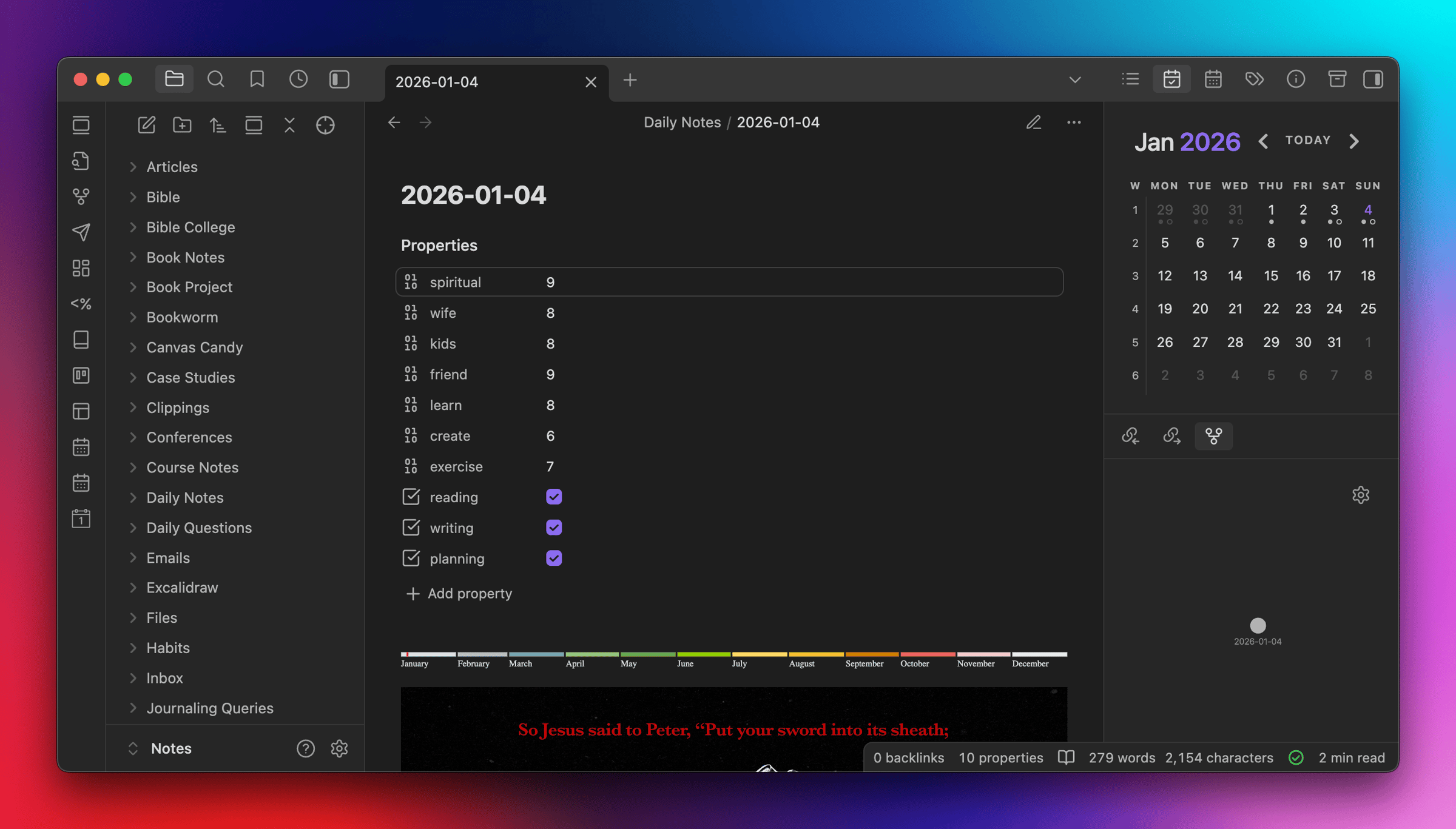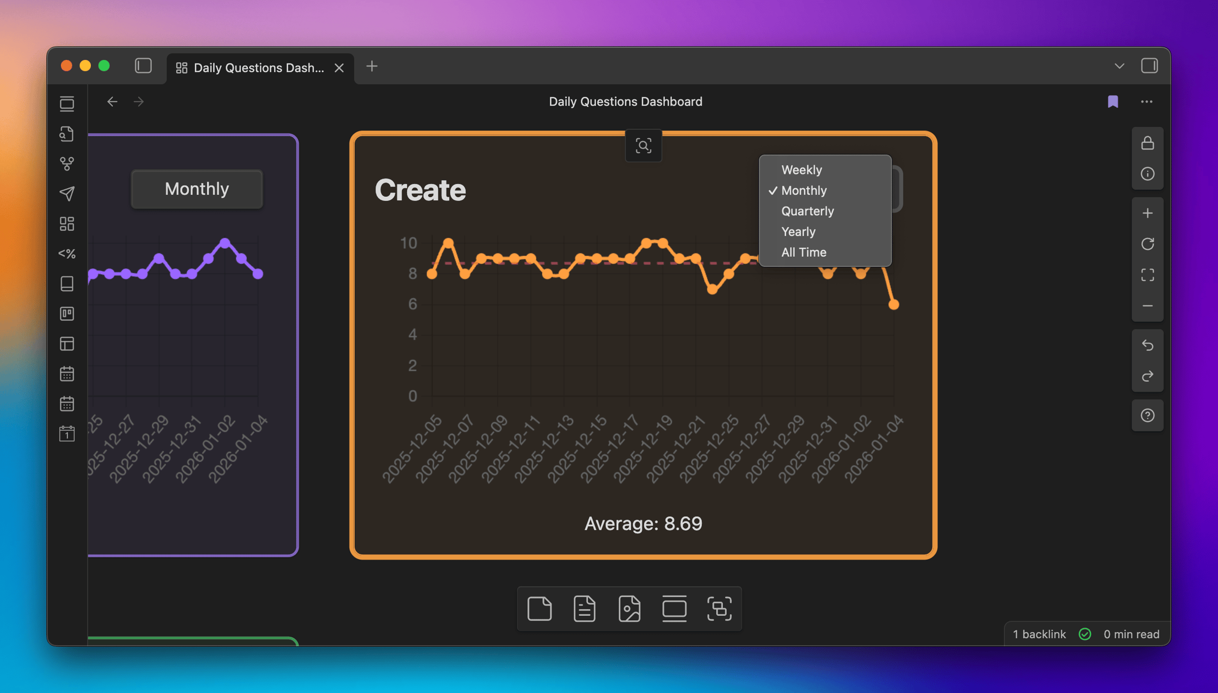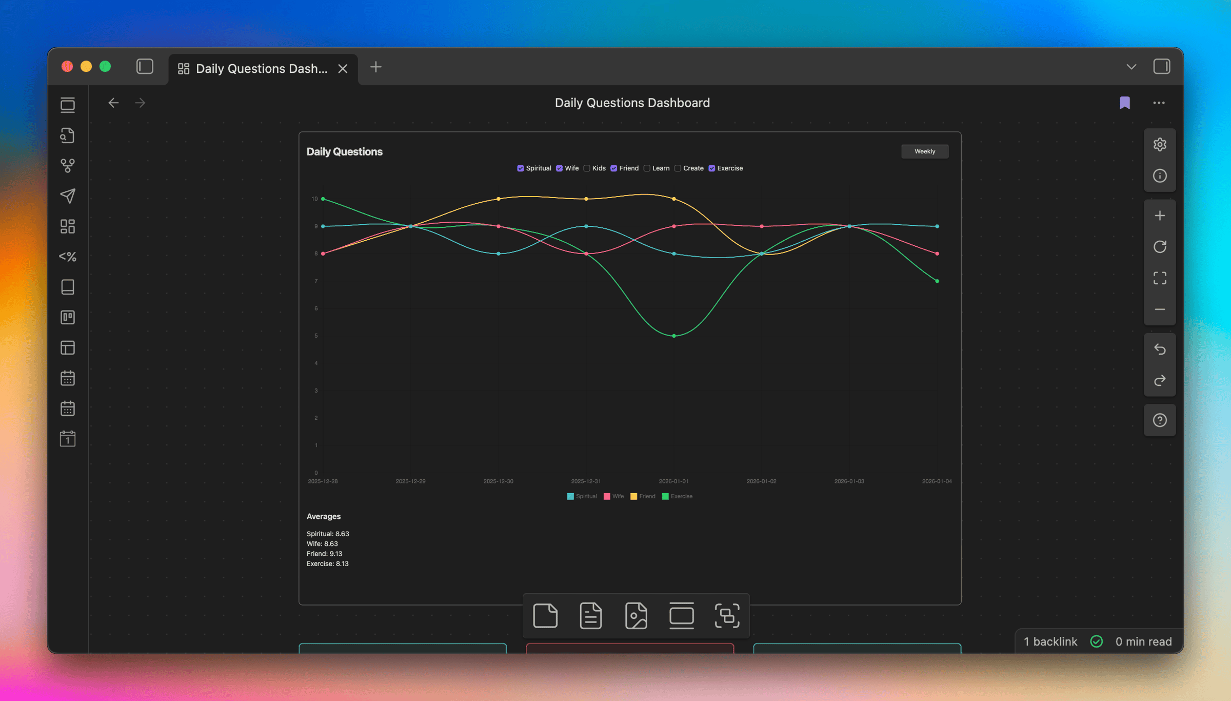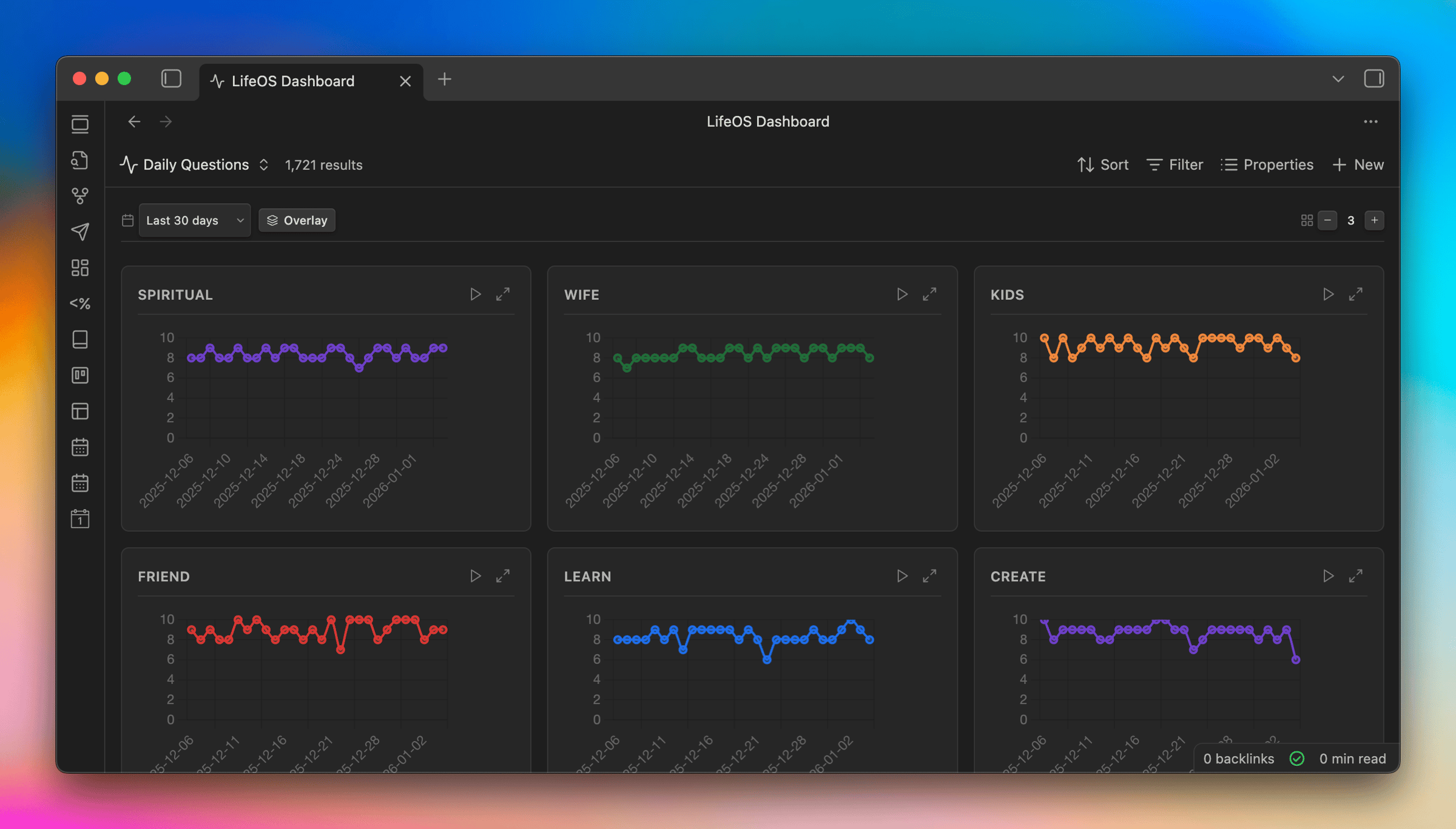 But in the last two weeks, I rebuilt this whole workflow from scratch using Daily Note properties instead. In this newsletter, I’m going to show you how I made the switch. But first we need to talk about why. The Future is PropertiesThe biggest thing to happen to Obsidian last year was the release of the Bases core plugin. This added the ability to view, filter, and edit data from properties attached to your Obsidian notes. While Properties had been around for a while, the release of Bases made it clear just how important these were going to be in Obsidian going forward. The minute that I started playing with Bases, I knew the writing was on the wall: my tag-based journaling workflow was going to need to be replaced. I’ve been dragging my feet with moving everything to Properties, but got inspired a couple of weeks ago when someone in The Library mentioned a pretty cool plugin called Life Tracker that allowed you to create a dashboard in Bases to visualize your property metadata. At first glance, I thought I had struck gold. I was able to create a pretty impressive looking dashboard inside of a Bases view that showed me historical data on all my journaling prompts in a cool-looking line graph, and could even select from a few different colors to make it a little more visually appealing: Pretty quickly though, I started to hit the glass ceiling with this approach. As I started looking for ways to customize these graphs, I recalled Tim Miller writing about visualizing data using DataviewJS. Unfortunately, I know nothing about writing DataviewJS and quickly got lost in the code explanations. But then I had a crazy idea: could I get Claude to help me write the code to visualize the data the way I wanted? Short answer: Very much yes. Building My New Daily Questions DashboardThe graphs I built this way were pretty straightforward: they have a solid line that shows my Daily Questions scores for the specific properties the scores are assigned to. There’s a little bit of flex (or tension) in the line graph, and the dotted line represents the average score for the time period shown on the graph. This is already way better than my old Tracker-based dashboard, but then I was also able to add a button to each code block in Canvas that allows me to select different time periods to display: So now I no longer have to update the date values in the Tracker code, and I can just select the time period I want from a drop-down menu. All the data instantly gets updated, and the averages on the bottom are calculated just from the visualized data that’s being shown in the graph. I’m actually working on a video that walks through all the code, but here it is if you want to download it yourself. Just know it’s still a little bit of a work in progress. Then I had another crazy idea: could I combine these all into one graph and toggle the individual properties on or off? Again, yes. So I have another combined code block which shows each property as a different color and the averages below the graph for each score being shown: You can toggle the checkboxes at the top to choose which lines show up on the graph, and again, there’s a button to display different time periods here. And all of these graphs render incredibly fast (much faster than my old Tracker graphs did). I’m still tweaking this one to get it just right, but once I do, all of this will be added to the next version of LifeHQ 😉 Setting Up the Note PropertiesAgain, note properties are the key to making this all work. Each graph up above is simply showing the numerical values associated with a particular property over time. Here’s what it looks like at the top of a Daily Note: In order to update these, I also had to modify my Daily Questions Shortcut I walk through here. The basic concept is the same: