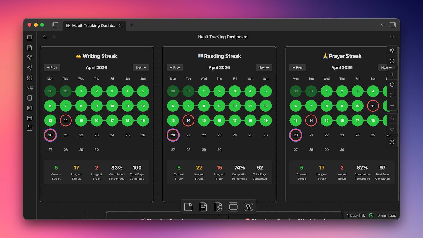 Prefer to read (or listen to) this newsletter in your browser? Click here. A couple of years ago, I built my own habit tracking dashboard in Obsidian. But looking back, that version had a few problems: It relied on a plugin called Tracker that added friction (and occasionally broke when Obsidian updated) It was painfully slow to load whenever you viewed your data Customizing the charts was a pain and meant digging into hard-coded snippets So with an assist from Claude, I rebuilt the whole...